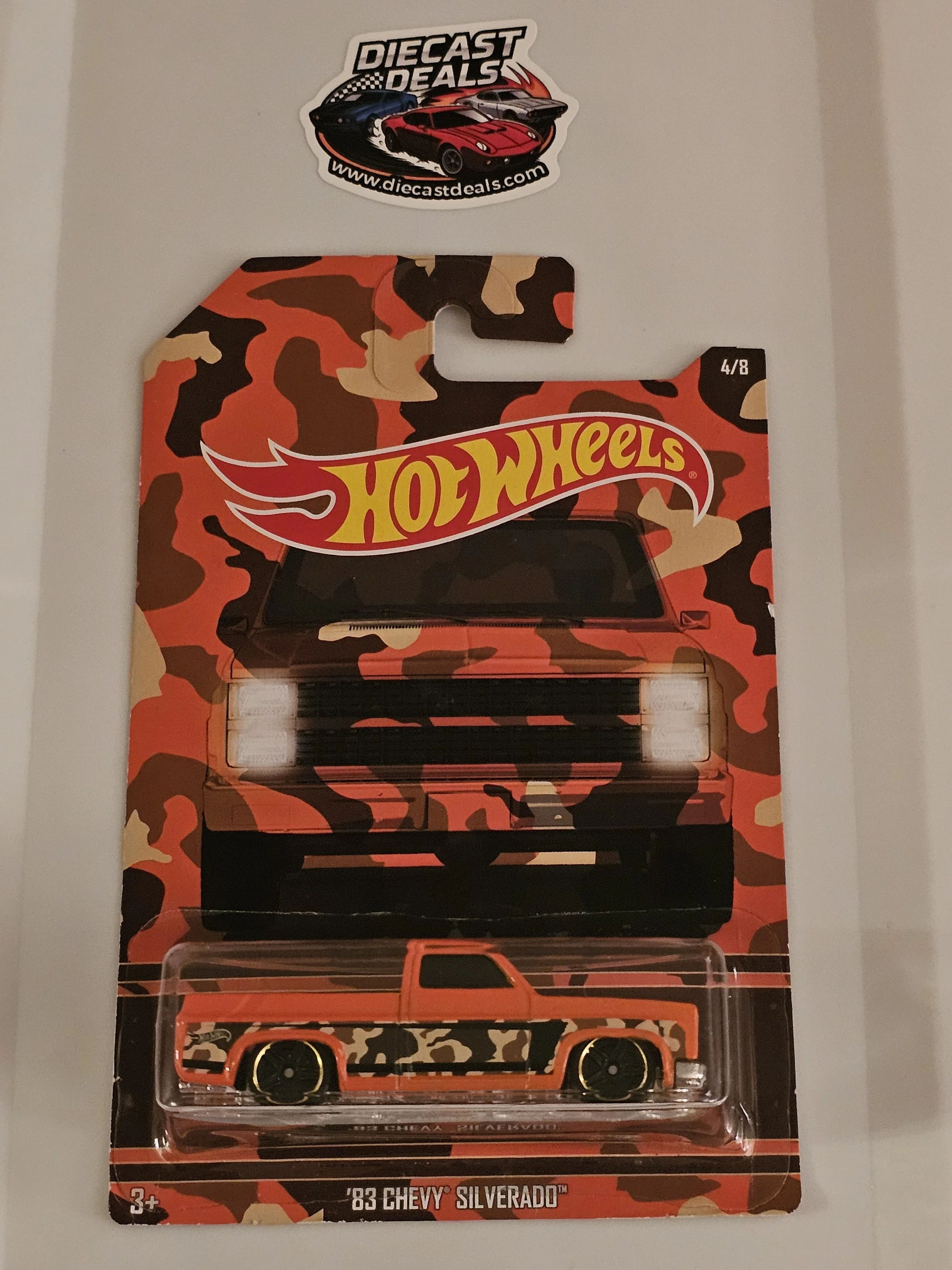 The Hot Wheels '83 Chevy Silverado Camouflage Set is a highly sought-after collectible toy featuring a 1:64 scale pickup truck with a unique camoflage theme. Made of plastic and manufactured in Malaysia, this multi-coloured and orange vehicle is part of the Chevy Silverado series by Hot Wheels. This rare unopened box set is a must-have for car enthusiasts and collectors alike, showcasing a customised Chevrolet pickup truck that is sure to stand out in any collection.